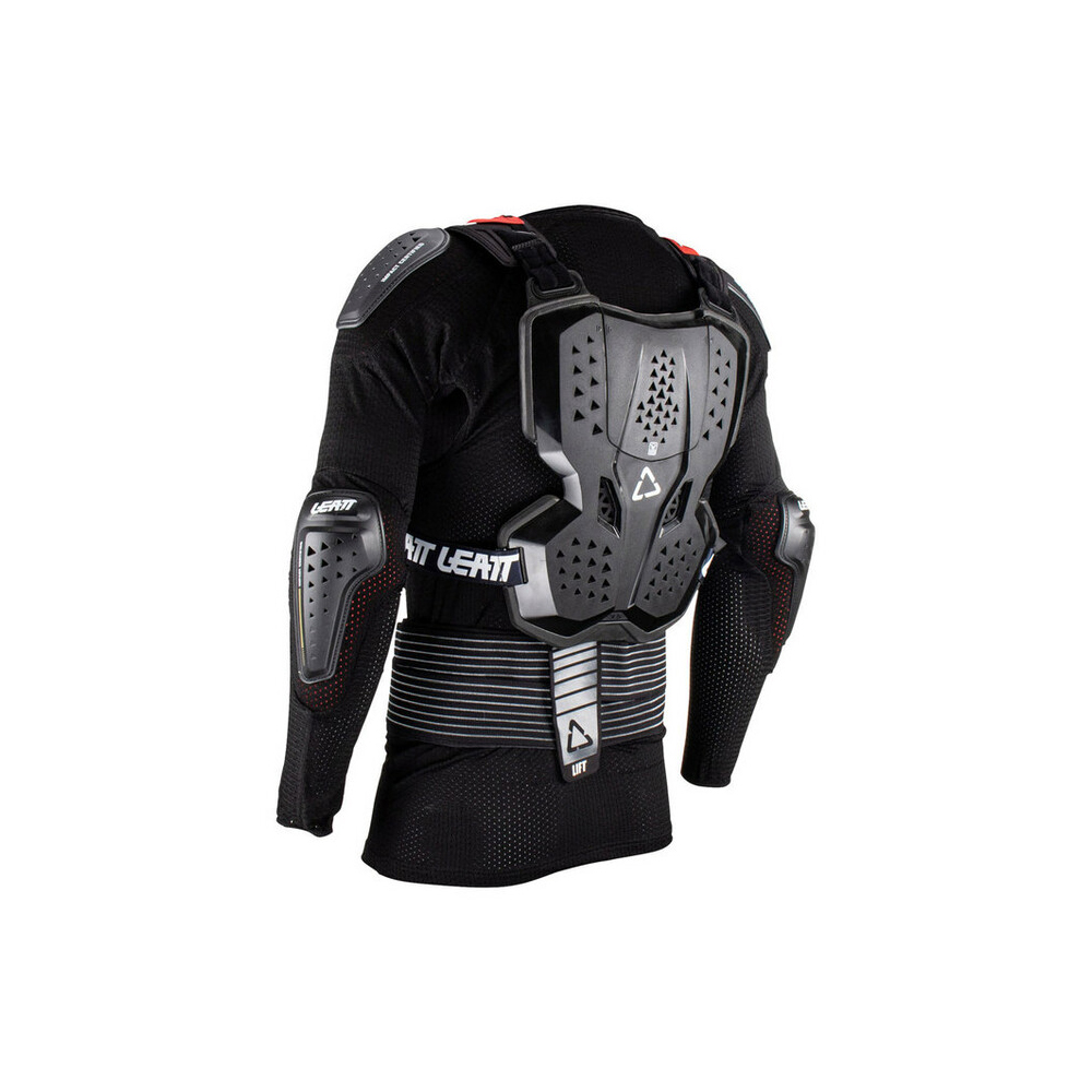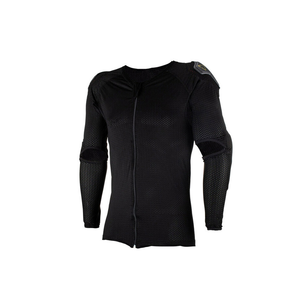 Con una estructura en dos piezas, por una parte una camiseta de compresión con protecciones integradas en hombros y codos y por otra parte un peto convecional de estructura rígida en pecho y espalda.